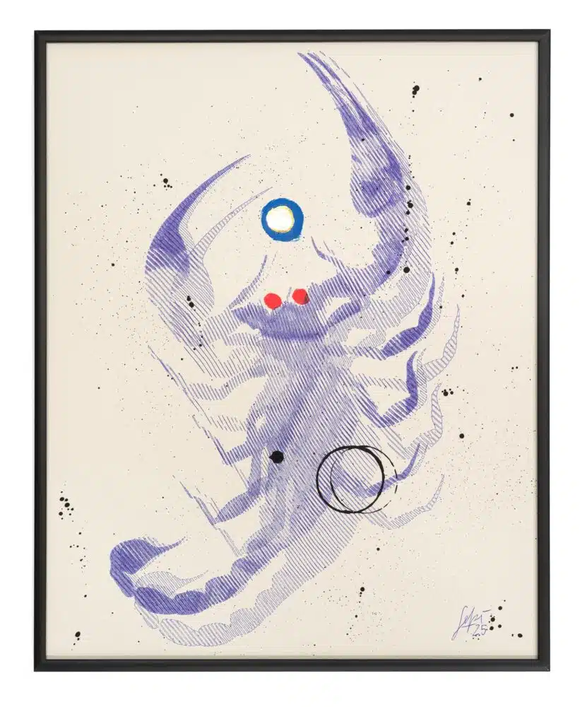 The Endless Search for Princess Peach — Mario has been running since 1985, through castles, worlds, and 200+ games, and the princess is always in another one. The search sustains itself by never arriving — the game ends the moment she's found, so the system needs her gone. Here the search becomes visual: the silhouettes are doubled, offset like a Doppler effect, the image splitting as if seen through venom. A scorpion's shape emerges from the blur — poisoned vision, the world warping around the obsession. Only when the eye concentrates, pushes through the distortion, does the princess appear inside, barely there, almost hallucinated into existence. Red crayon dots glow like eyes in the haze, spray drops and cup rings give the gaze something to hold onto while the image refuses to settle. Sisyphus pushed the boulder because the gods needed him busy; Mario runs because Nintendo needs him selling. The endless search is not a failure of finding — it's the point. The princess exists most when she can't quite be seen.